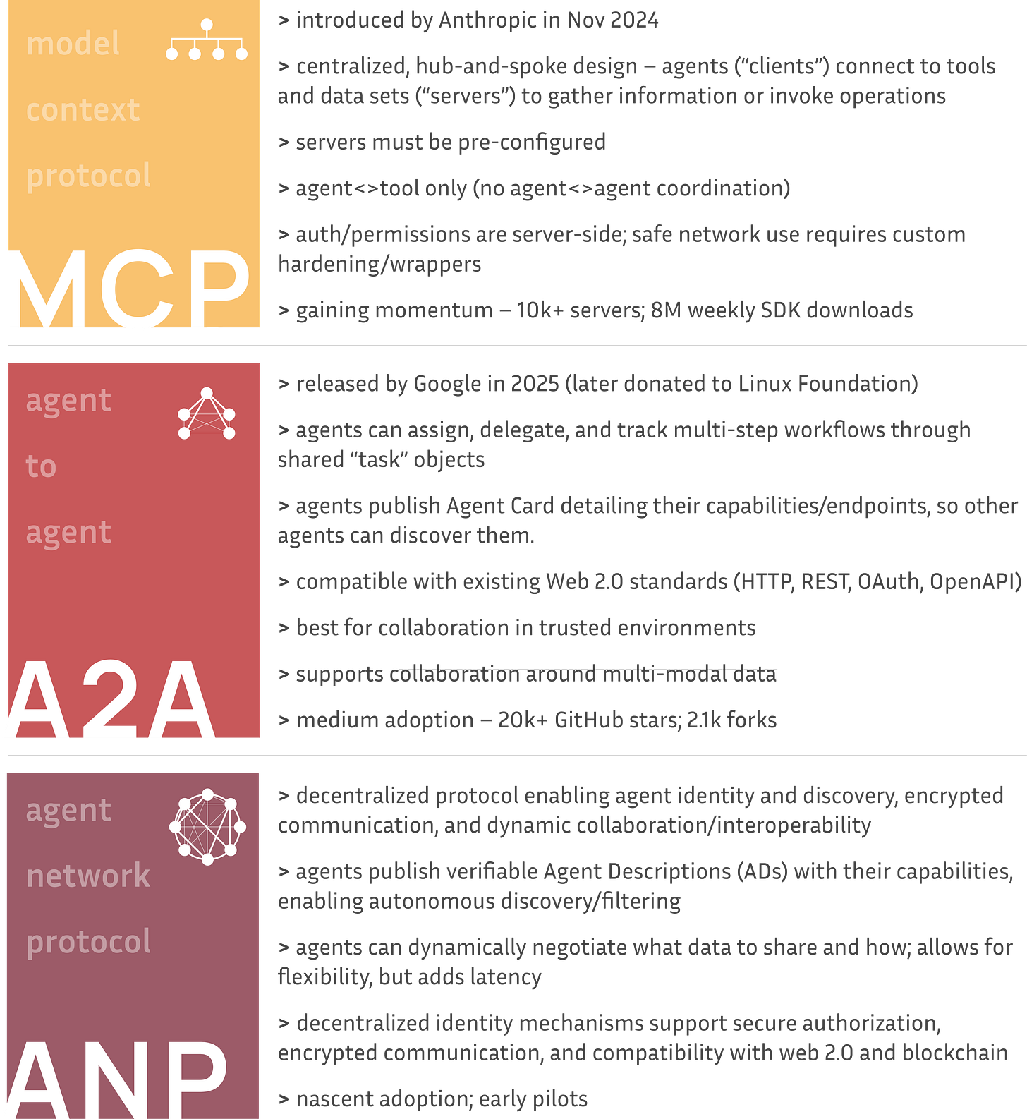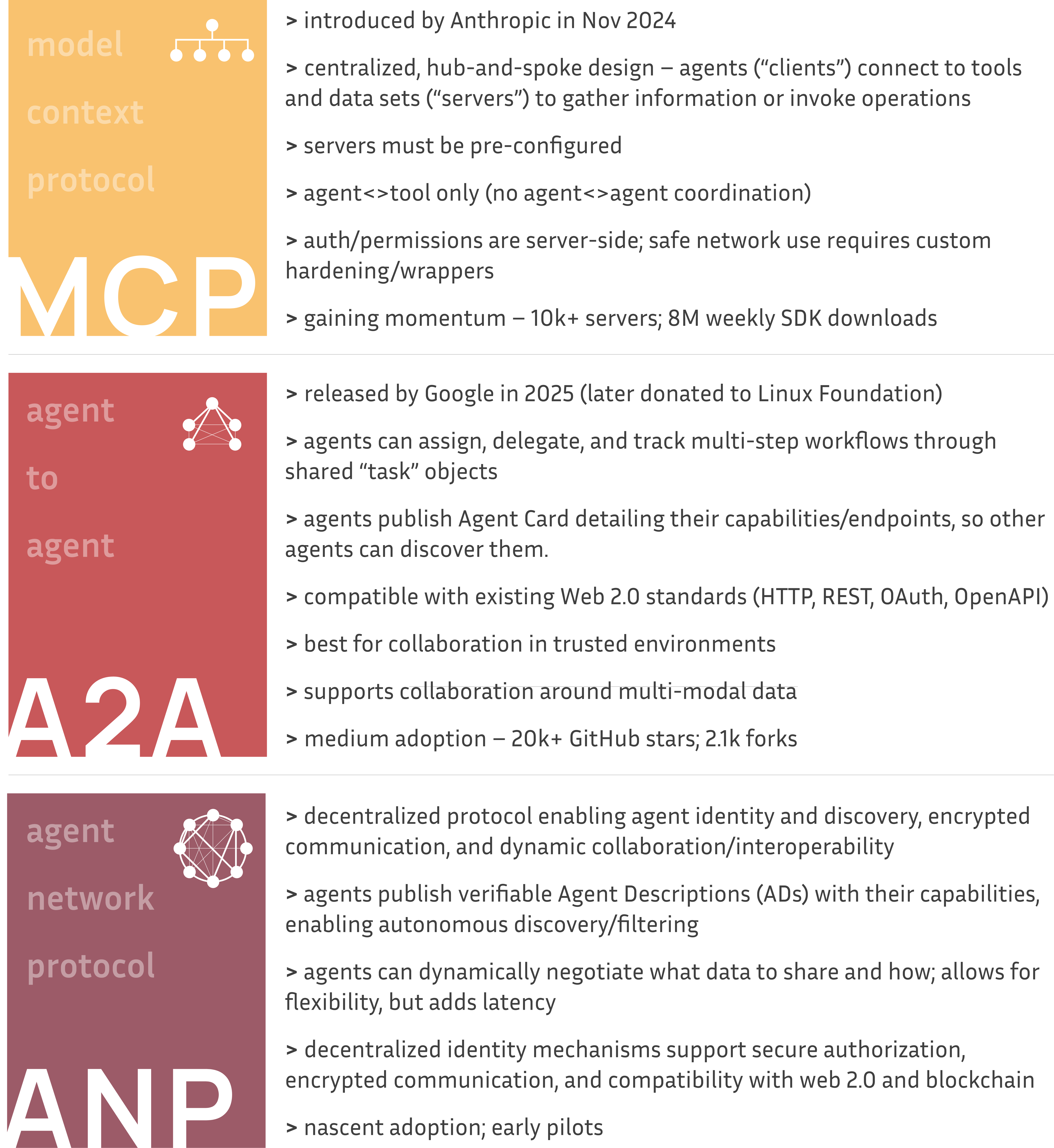 (i) Native security. Right now, both MCP and A2A depend on external security – they assume the environment they’re running in is safe. ANP encrypts data in transit, but the data becomes vulnerable once it’s decrypted for use. To safely handle sensitive workloads in domains like healthcare, finance, or law, these protocols need stronger, built-in safeguards.