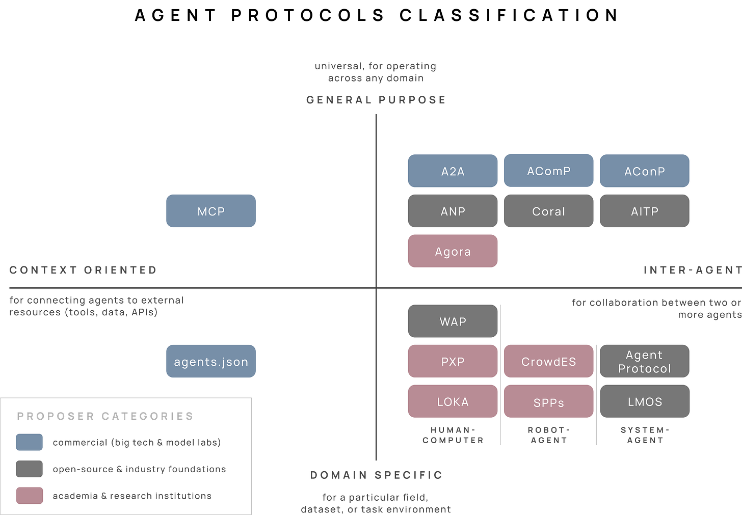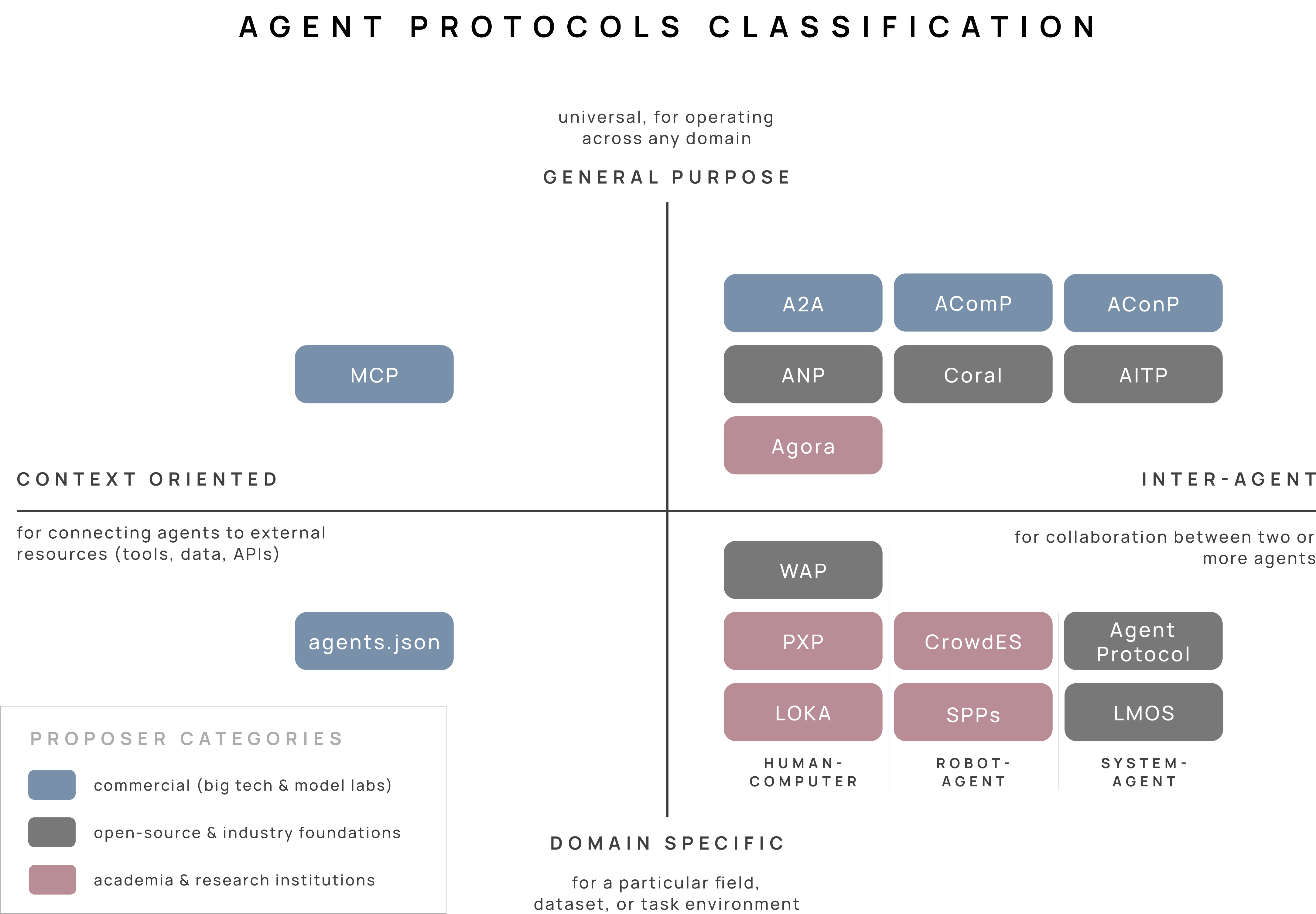 The 2x2 chart below maps the landscape of agent protocols, across two dimensions: