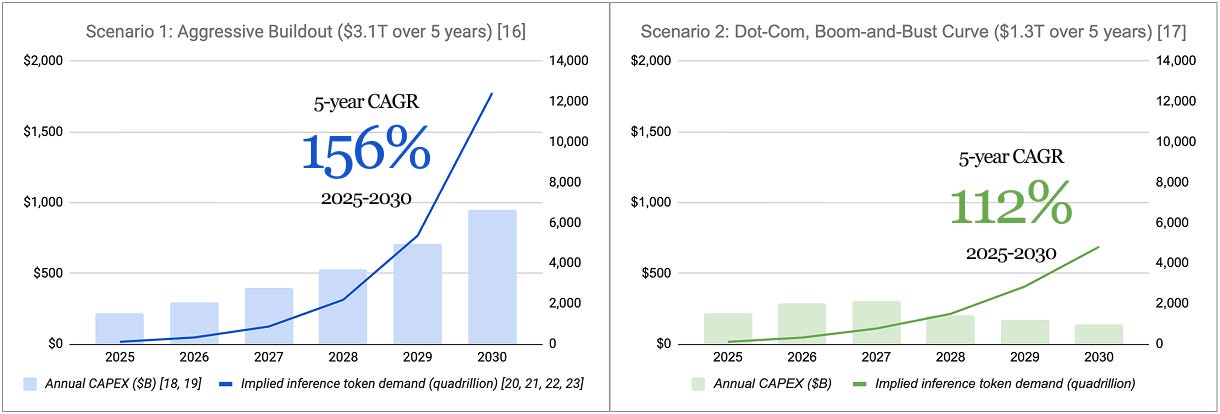 Based on this, an aggressive, $3.1T buildout over the next 5-6 years implies AI usage must compound at 156% every year through 2030. A more conservative $1.3T path still requires 112% annual growth.
