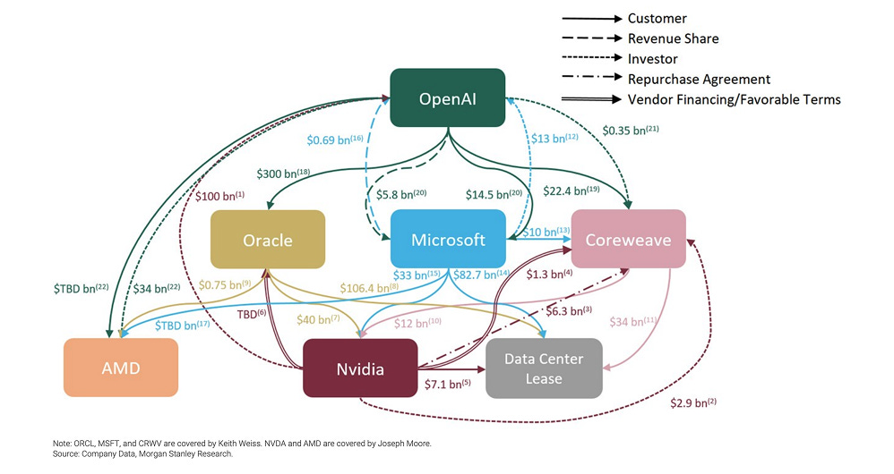 Circular financing is back: Chipmakers, cloud providers, and model labs are funding one another through prepaid deals, minimum-spend guarantees, off-balance-sheet projects, and direct debt and equity positions — arrangements that can inflate real demand.