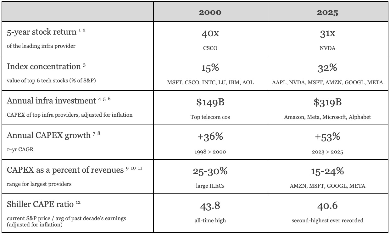 In 2000, investment went into networks of fiber and routers, long-life assets financed mostly with debt.13 Today’s infrastructure – GPUs and servers – depreciates faster, and is funded by cash-rich tech giants (though some leverage is making its way into the system). And unlike in 2000, today’s market is concentrated around firms with real, 15+ year moats in distribution, data, and developer ecosystems.